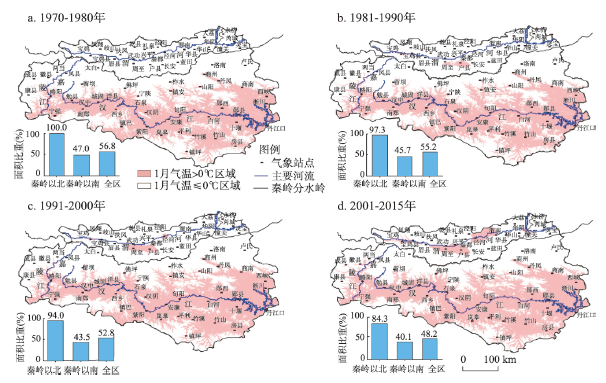 ① 20世纪70年代,1月份0 ℃等温线位于秦岭南麓。以分水岭为界,秦岭以南低于0 ℃区域面积比重为47.0%,秦岭以北低于0 ℃区域面积比重为100%。