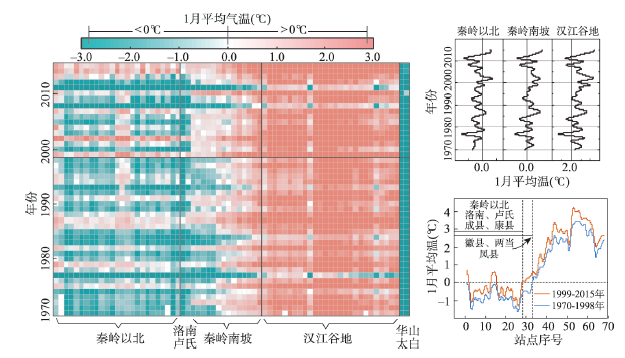由于空间插值存在不确定性,以站点尺度为视角,再次确认秦岭南北地区1月温度变化规律的可信性(图5)。结果表明:① 秦岭以北地区1月份气温整体位于0 ℃以下,秦岭南坡属于过渡地带,并存在明显的年代转折,汉江谷地1月份气温整体位于0 ℃以上;② 在年代变化上,1993-2002年秦岭南北1月份气温呈现明显的上升趋势,2003-2015年气温呈现出波动下降趋势,年代性转折在秦岭南坡1月份气温变化曲线体现的尤为突出;③ 在空间变化上,对比1970-1998年和1999-2015年秦岭南北各站点1月气温变化,以“秦岭以北—秦岭南坡—汉江谷地”顺序排列站点。可以清楚看到,相比于1970-1998年,1999-2015年秦岭南北1月气温明显上升。1998年之前,秦岭以北多数站点,包括秦岭南坡的洛南、卢氏、成县、康县、徽县、两当和凤县等7个站点,1月气温低于0 ℃以下;1998年之后,秦岭南坡的徽县、两当、凤县,包括秦岭以北的西安、宝鸡地区,1月气温明显超过0 ℃,其他区域1月份气温仍处于0 ℃以下。