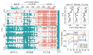 结果表明:① 1970-1997年,秦岭以北和秦岭南坡≥ 10 ℃积温天数多在220 d以下,汉江谷地西北部积温天数在220~240 d之间,汉江谷地东南积温天数则在240 d之上,说明秦岭以北和秦岭南坡处于暖温带,汉江谷地大分部区域为北亚热带,这与秦岭南坡作为北亚热带北界结论具有一致性;② 对比1970-1984年和1985-1997年两个时期,发现秦岭南北积温天数变化并不明显,说明秦岭南坡作为北亚热带北界的作用,稳定且持续到20世纪90年代末;③ 1998-2015年,秦岭南北3个区域≥ 10 ℃积温天数均发生明显的变化。其中,秦岭以北积温天数在220 d以上,但是低于240 d;秦岭南坡积温天数也超过220 d,并且这些站点主要分布于秦岭南坡的中段;对于汉江谷地而言,积温天数则整体超过240 d,已纳入亚热带范围。