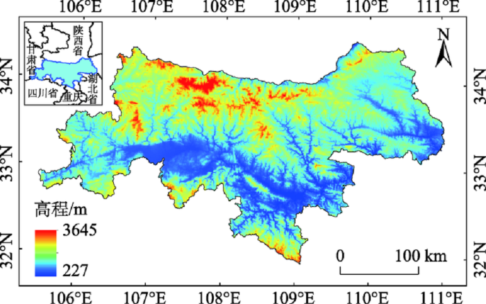 本文选取位于陕西省境内的秦岭山脉所覆盖区域为研究区,也是狭义秦岭所在区域,地理坐标为:31°55'~34°35' N,105°40'~111°05' E。秦岭地区位于渭河平原以南,汉江谷地以北,是中国南北气候的过渡区域,也是北方干冷空气南下和南方暖湿空气北上的自然屏障。秦岭地区地形起伏明显,最大高 程秦岭主峰太白山约3645 m,最小高程约277 m, 其最大高程差异为3300 m。研究区主要包括汉江以北谷地、秦岭山地及渭河谷地南缘3个地理单元,以及嘉陵江、洛河、渭河、汉江等主要河流。研究区以秦岭主脉为界线,南北坡的气候差异显著,北坡为暖温带气候,南坡为亚热带气候。植被以落叶阔叶和常绿阔叶混交林为主,其特殊的空间位置、地形地貌和气候条件是中国中部重要的生态屏障,也体现着全球气候变化敏感性。研究区位置和范围如图1所示。