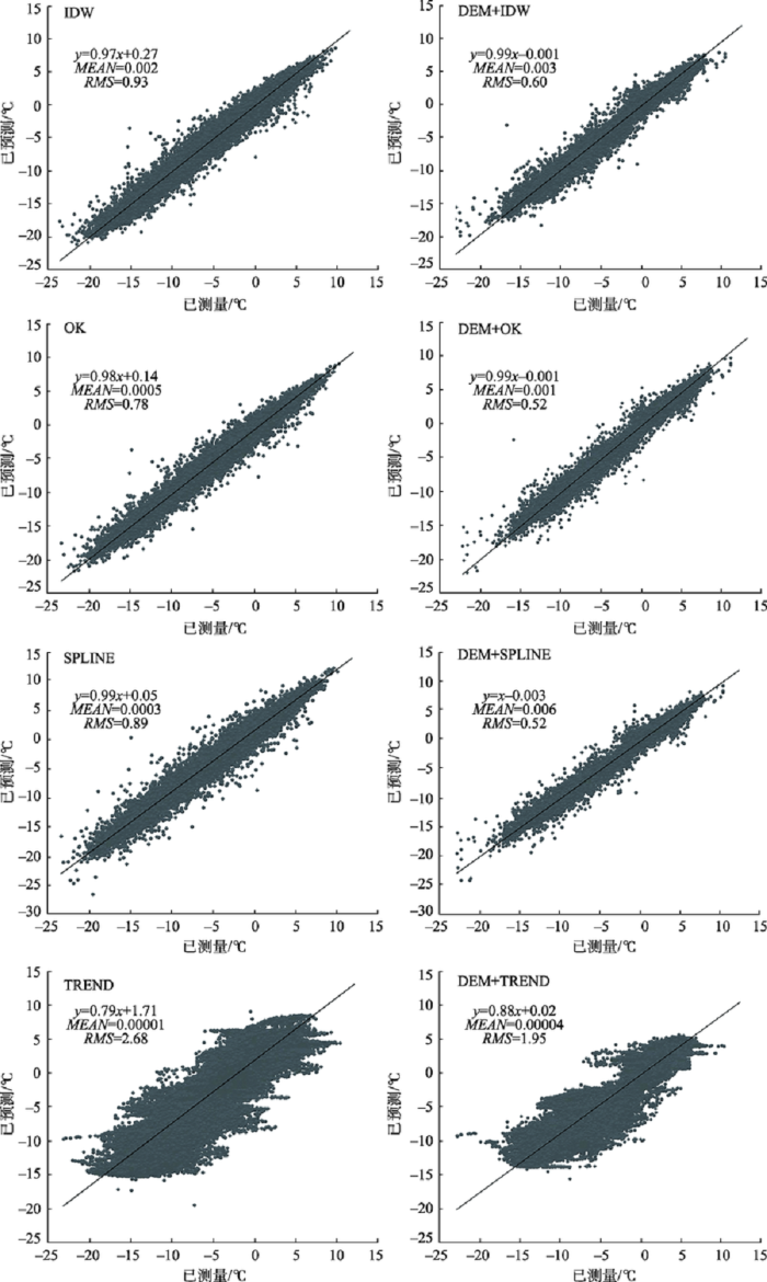 DEM+OK和DEM+SPLINE方法的精度最高,TREND方法的RMS最大,精度最低。基于DEM修正的4种插值方法与未加入DEM修正的4种插值方法相比精度有显著的提高。DEM+IDW与IDW方法相比RMS降低0.38 ℃,DEM+SPLINE与SPLINE方法相比RMS降低0.31 ℃,DEM+OK与OK方法相比RMS降低0.32 ℃,DEM+TREND与TREND方法相比RMS降低0.78 ℃,精度平均提高0.45 ℃。空间插值精度由高到低:DEM+OK和DEM+SPLINE>DEM+IDW>DEM+TREND>OK>SPLINE>IDW>TREND。