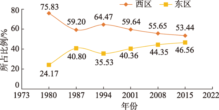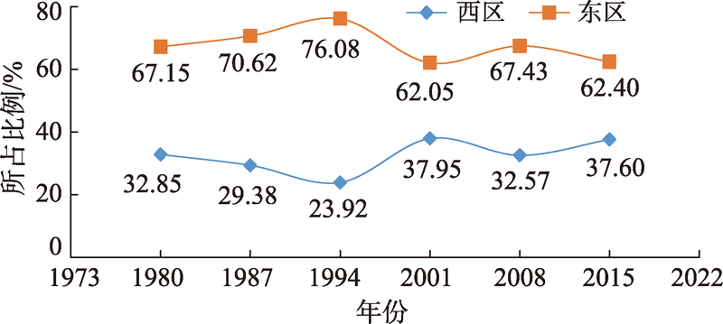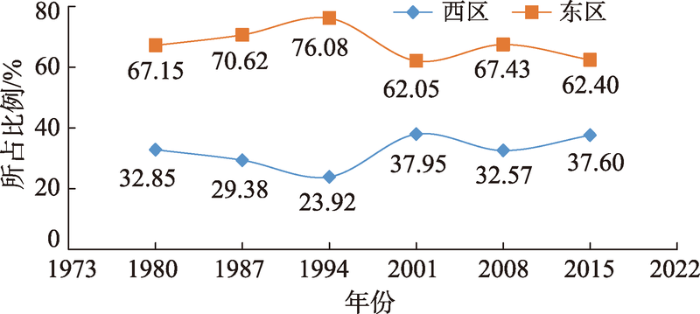 由于四区、五区的降雨侵蚀力重心迁移变化主要集中在水平方向,所以主要进行东西方向的分析(图12)。如图13所示,四区作为全流域重心点分布最为集中的区域,1980-1994年其东区的降雨侵蚀力比重处于上升阶段,使降雨侵蚀力重心也一直处于往东偏移的状态。但2001年,西区所占的比重迅速下降至62.05%,低于1980年的比重,这使四区的降雨侵蚀力重心向西方向偏移,且位置要比1980年的重心点位置更偏西。这一点在重心迁移范围上也有显现,1994-2001年的重心迁移范围猛增至1601.46 km2,远远高于其他时期内的迁移范围值(表2)。可见,此期间内,四区的降雨分布出现了较为显著的变化。