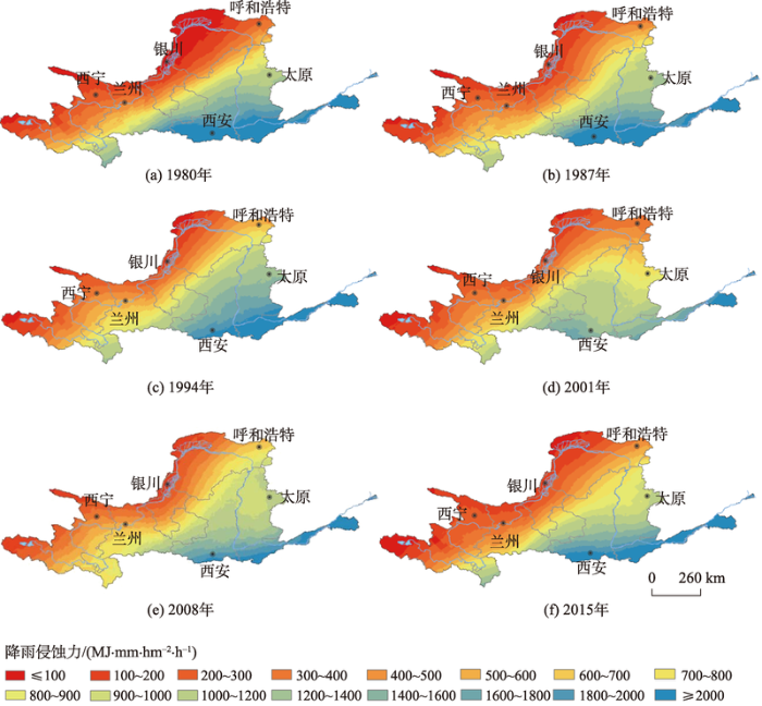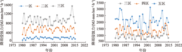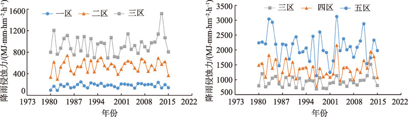 黄河流域内年降雨侵蚀力差异较大。黄河流域的年降雨侵蚀力呈现由西北向东南增加的趋势,这和流域内降水分布情况相一致。西宁、银川所在的一区属于历年来降雨侵蚀力最弱的区域,其年降雨侵蚀力常年在200 MJ·mm·hm-2·h-1左右波动,而西安所在五区属于降雨侵蚀力最强的区域,其年降雨侵蚀力常年大于1000 MJ·mm·hm-2·h-1。随着黄河流域的年降雨侵蚀力的增大,其波动幅度相应增大。西安所在五区年际间波动尤其剧烈,而西宁、银川所在的一区历年降雨侵蚀力最小,其波动幅度也最小。