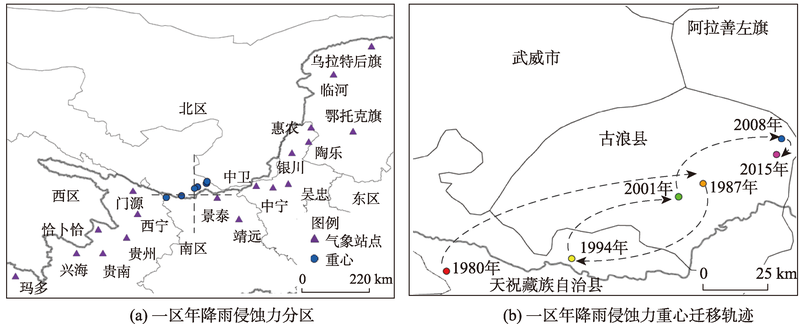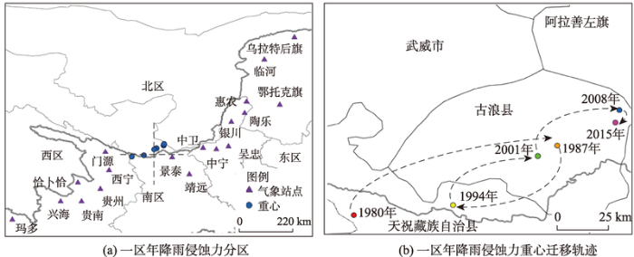 由于重心点存在分布范围广,运动轨迹复杂多变等特点,为便于分析,按照年降雨侵蚀力重心分布的位置对每个区域再进行细分,在水平方向分成东区和西区,在竖直方向分成南区和北区(图7(a))。