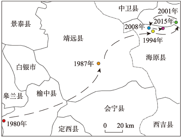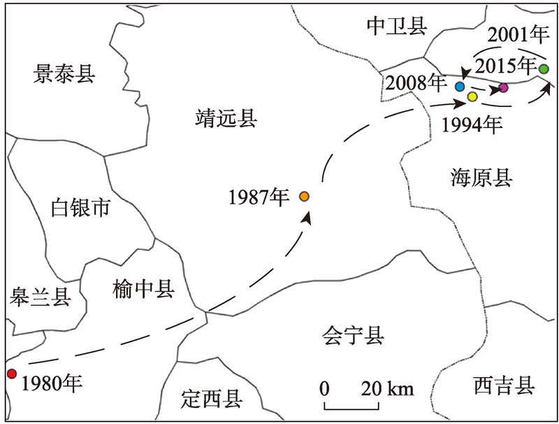 区域 | 年份 | 经度 | 纬度 | 迁移方向 | 迁移距离/km | 迁移范围/km2 |