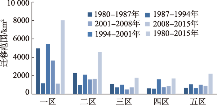 利用ArcGIS 10.2中的最小边界几何工具,获得1980-2015年各时间段内各区年降雨侵蚀力重心的最小面积外接矩形作为重心的迁移范围,其面积统计如图6所示。1980-2015年,从一区至五区的年降雨侵蚀力重心的外接矩形面积处于先递减后增大的变化状态,一区的年降雨侵蚀力重心的活动范围最大为8007.34 km2,四区的年降雨侵蚀力重心的活动范围最小为1698.67 km2。一区在1984-1994年和2008-2015年,这2个时间段内的重心迁移范围最小,可见该时期内其区域内的降雨分布相对于其他时间段而言差异最小;而二区只在1987-1994年出现了较小的重心迁移范围,仅有981.08 km2;三区、四区和五区从1980-2015年各个时间段的重心迁移范围一直都保持在1000 km2左右,仅有四区在1994-2001年出现了较大的重心迁移范围,达1601.46 km2。对比各个时间段可见,一区作为5个区域内年降雨侵蚀力最小的区域,其各时间段内的年降雨侵蚀力重心迁移范围的变化最为显著,其年降雨侵蚀力重心的外界矩形面积最大达5422.17 km2,最小仅有1135.13 km2。而年降雨侵蚀力相对较大的区域,如三区、四区和五区,其各时间段内的年降雨侵蚀力重心迁移范围的变化则相对缓和。