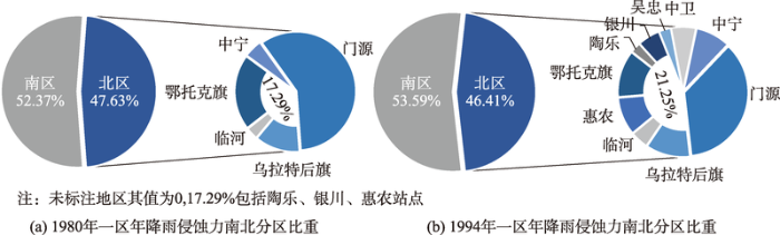 由图8可知,1980-2015年西区的年降雨侵蚀力比重总体处于下降趋势,一区的年降雨侵蚀力重心总体上处于往东移动的状态。由图9(a)、(b)可知,1980年北区年降雨侵蚀力的比重主要受重心点附近的门源地区的年降雨侵蚀力的影响,而1994年,北区银川以北区域的年降雨侵蚀力比重迅速增加,远高于其在1980年的比重,这极大地影响了 1994年的年降雨侵蚀力重心点的空间位置,使之重心点比1980年更偏北。