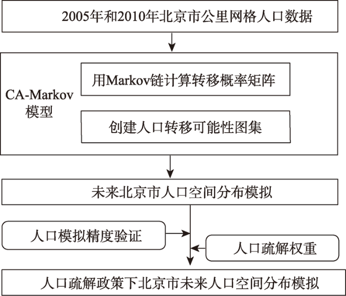 本文以北京市2005年和2010年公里网格人口分布数据为基础,运用CA-Markov模型模拟了北京市2015、2020、2025和2030年4期公里网格人口分布数据集;应用街道尺度的人口数据对模拟精度进行了验证;在模型可靠性良好的基础上,从产业疏解推动人口疏解的角度出发,结合北京市各街道各产业从业人口数据、产业疏解方向和中心城区人口疏解目标,确定了北京市各街道人口疏解的权重,并由此预测了2020年北京市中心城区人口疏解15%后的人口空间分布情况。研究表明: ① 2005-2010年,北京市约90%的公里网格人口密度等级为1级,集中在密云区、怀柔区、延庆区和房山区,而人口密度在10级以上的区域集中在西城区和东城区;② 在无人口疏解政策影响下,2015-2030年北京市公里网格人口分布呈现出低人口密度区域减少、中高人口密度区域增加的态势;③ 在人口疏解政策影响下,至2020年,中心城区人口分布从集中于中高密度等级转向集中于中低人口密度等级。中心城区最高人口密度等级的数值呈下降态势,并且高人口密度等级的区域占比也呈下降态势。除东城区外,其余5个中心城区的人口集中于人口密度等级为5-8级的区域。本文的研究成果可为人口管理、资源配置和政策制定提供科学参考。