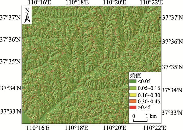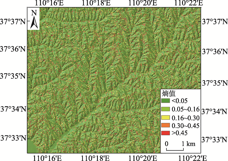 利用熵值计算得出本文方法地形部位分类结果的不确定性程度分布,如图10所示。不确定性空间分布表明,分类结果中熵值较高的地区多位于沟谷等部位,这是因为在沟蚀地貌中,相较于其他地形部位,沟谷地区地形更加复杂多变,从而导致在初始地形部位分类时更容易产生破碎现象,以至面向对象分类结果不确定性偏高。分类结果中熵值较低的地区分布于直背坡和平区,其原因在于,相较于其他地形部位,直背坡和平区地表形态特征更为简单,因而在分类中需要被综合的破碎地形部位也就更少,即相对于而言,这些区域分类不确定性低。然而,值得注意的是,样区内整体熵值偏低,特别是在沟谷与坡面之间的地形复杂区域,该现象表明熵值对于面向对象地形部位分类不确定性指示性较弱,这也与文献[2]所得结论基本一致。