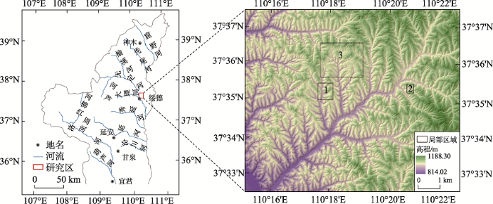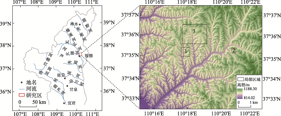 本文选取了陕北黄土高原韭塬沟区域为实验样区,该样区位于无定河中游,隶属黄土峁状丘陵沟壑地貌,丘陵起伏,沟壑纵横,土壤侵蚀极为剧烈。样区海拔814~1188 m,相对高差374 m,地面平均坡度29°,沟壑密度6.52 km/km2。实验数据为国家测绘局生产的1:1万比例尺5 m分辨率DEM和与DEM空间匹配的1 m分辨率DOM数据。样区由4幅邻接的1:1万图幅拼接而成,面积约100 km2。样区位置、样区高程分布以及用于文后实验对比分析的局部区域分布(图3)。