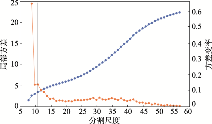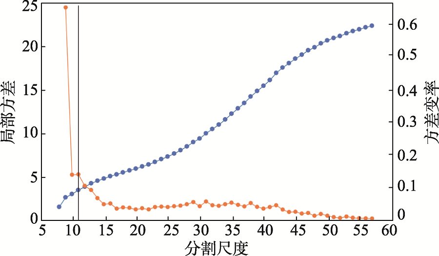 在分割过程中,选择适宜的分割尺度是关键。过大的分割尺度会使较小的对象丢失,而过小的分割尺度又会导致过分割现象,使得分割对象过于破碎。除分割尺度外,分割参数还包括有形状(与光谱和为1)、紧致度(与平滑度和为1)。分割参数对于对象分割有重要的影响。最优分割参数表现为目标地物与分割对象的边界基本吻合,分割对象不会太破碎,边界较为清晰。对于最优分割尺度确定而言,应用最为广泛的方法为局部方差变率法,即通过统计分析不同分割尺度下对象的方差和方差变率探测合适的分割尺度[23]。本文以形状和紧致度步长为0.2的变量,对二者每一参数组合,运用局部方差变率法探测最优分割尺度,并将三者组合作为分割参数候选。对于每一候选分割参数的对象,通过叠加地形判定对比分析,得出较为最优分割参数。
