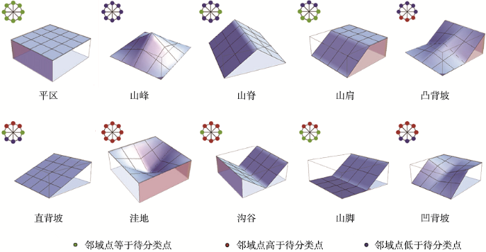 Geomorphons方法基于利用地形开放度指数计算的待分类栅格单元与8个方向邻域之间高、低、相等3种关系,组合出38种局域几何形态,再根据地学含义进行归整,进而依据所设计的映射表将其对应到10种地形部位[17](图1)。