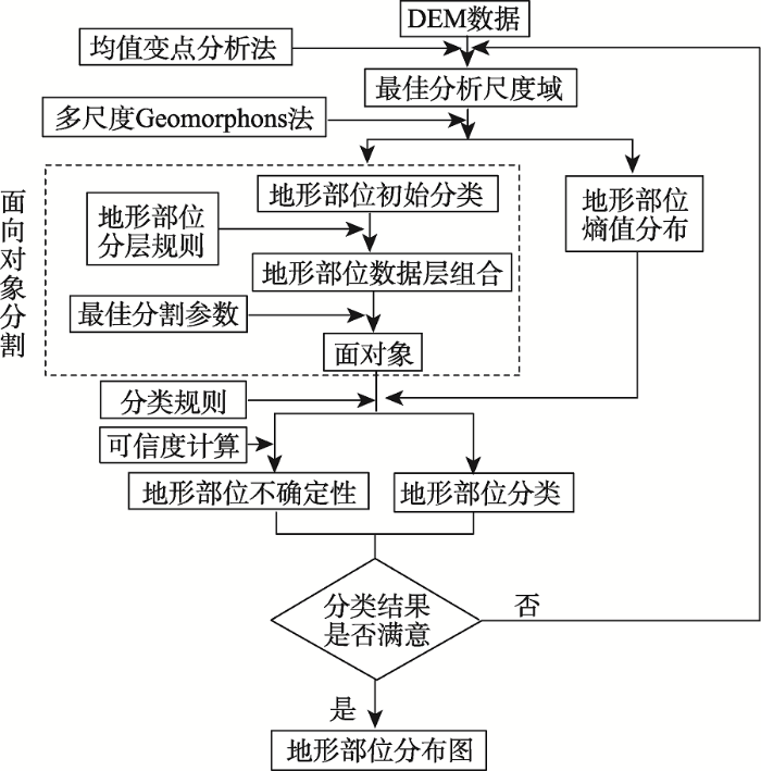 对于多尺度Geomorphons法而言,分析尺度域的选择因使用者经验而存在较大主观性,不同的分析尺度域对分类结果存在无法规避的影响。与此同时,多尺度Geomorphons法还存在逐栅格单元分类方法难以避免的分类结果破碎问题,这不仅与地形部位定义特征不相适应,而且在地学解释上也不具合理性。为此,本文构建了顾及多分析尺度的地形部位面向对象分类方法(图2):首先,采用均值变点法确定分析尺度域,根据多尺度Geomorphons法得到初始分类结果;其次,设定地形部位数据分层规则,获取地形部位数据层组合,并分析确定最优分割参数,进而得出分割结果;最后,基于分割对象,根据制定的分类规则及不确定性计算方法,获得地形部位分类结果及其不确定性分布。