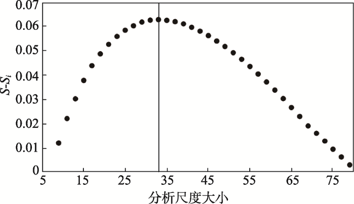 均值变点法的原理在于变点的存在会使原样本的统计量S与样本分段之后的统计量Si之间的差距增大,S与Si差值最大的点即为所求的变点。在分析出适宜分析尺度域后即可采用多尺度Geomorphons法进行地形部位分类。值得说明的是,根据平坡的坡度一般小于3°[21],本文将多尺度Geomorphons法中角度参数设为3°。