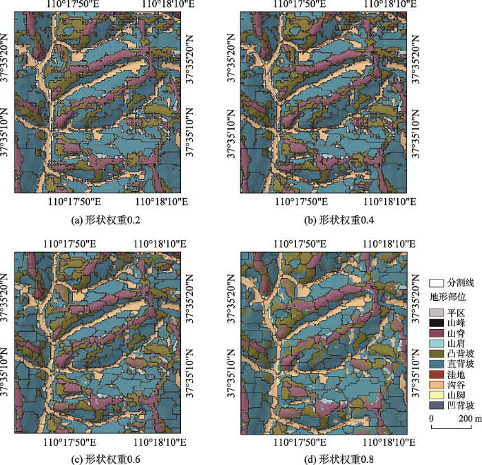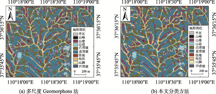 然而,不同地形部位的地表形态特征存在一定程度的差异性,其分类需要统筹考虑参数的多样性等方面,特别是适宜分析尺度域与研究区范围、数据源精度等多个因素相关。因此,如何在完善地形部位分类体系的基础上,结合多源地理空间数据(如DOM等),进一步在分析尺度域精确选取、角度阈值多样性特征、多层次对象分割以及分类精度等方面深入探究,是下一步研究的重点。