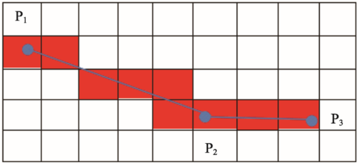 如图2所示,船舶由P1经过P2到达P3,红色的网格为船舶经过的区域。求船舶交通密度即计算单位时间网格单元内船舶通过量的期望值,当船舶轨迹与网格