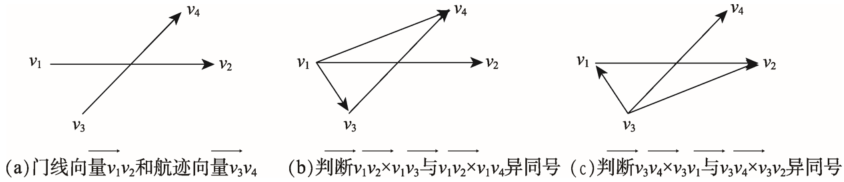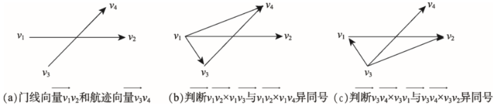 通过设置航道断面,对来往船舶进行统计发掘交通流规律常被学者所采用[22]。在本文中门线判定算法基于船舶在时间上相邻的2个位置点的坐标确定的线段(称为航迹向量)与门线的2个端点的坐标确定的线段(称为门线向量)的相对位置,来判定船舶是否经过门线:判断门线向量