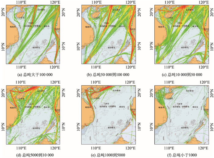 非大宗货运运输船舶如吨位5000~10 000的船舶主要包括邮轮、船长100~140 m散货船、集装箱船,油化船、滚装船和LNG&LPG,此类船已具有抗大风浪远海作业的能力,但对于长途大宗运输来说经济性不足,通常不会被选择使用,所以在图4(d)中典型空间分布呈现“外贸兼顾,内贸为主”的特点,南海主航路上的交通密度远小于沿岸区域之间的交通密度;吨位小于5000的船舶,如图4(e)-(f)所示,多以承担港口周边或者短途货物转运的作业为主,此类船舶多分布于沿岸及港口湾区。