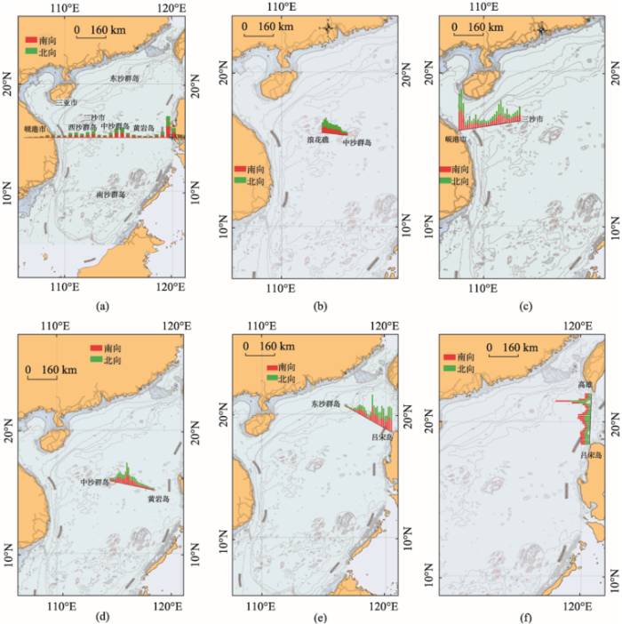 (1)如图5(a)所示北纬15°门线上的南北流量分布在2个高峰位置,分别为118.5°~120° E区域与112°~113° E区域,前者贴近吕宋岛为南下澳洲、印尼的主要航路所在;后者为浪花礁以南珠江三角洲和台湾海峡前往新加坡航路汇聚结点;