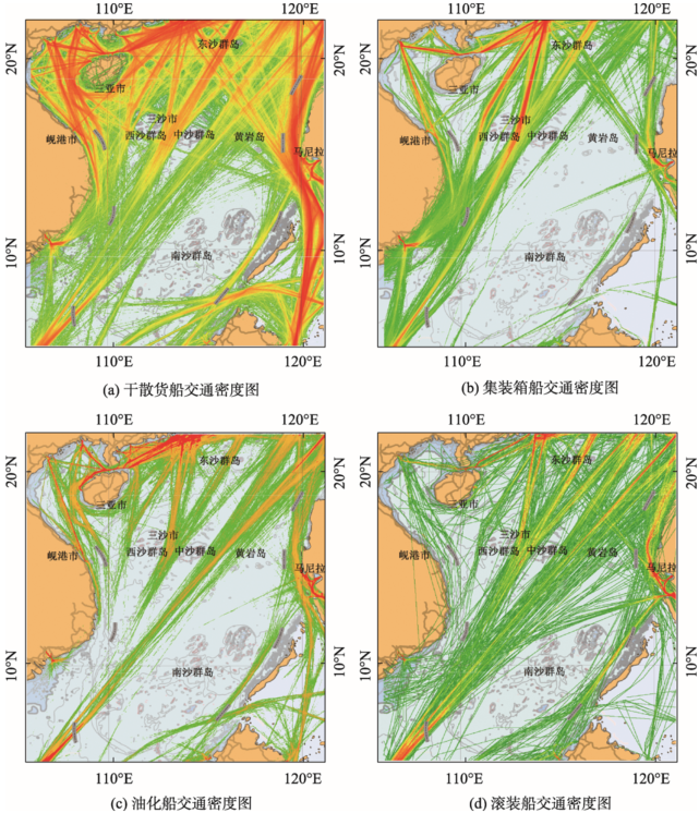 如图4所示,交通密度图中渐变性的颜色反映典型吨位区间船舶空间分布,南海作为全球贸易大通道,总吨大于10 000船舶为贸易运输的主力,该区间船舶包括巴拿马型及以上的干散货船和油船,3000标准箱(TEU)及以上的集装箱船,船长150 m以上的滚装船与液化天然气与液化石油气(LNG&LPG)船舶。通过计算该吨位区间的交通密度,如图4(a)-(c)所示南海贸易主要航路如下: