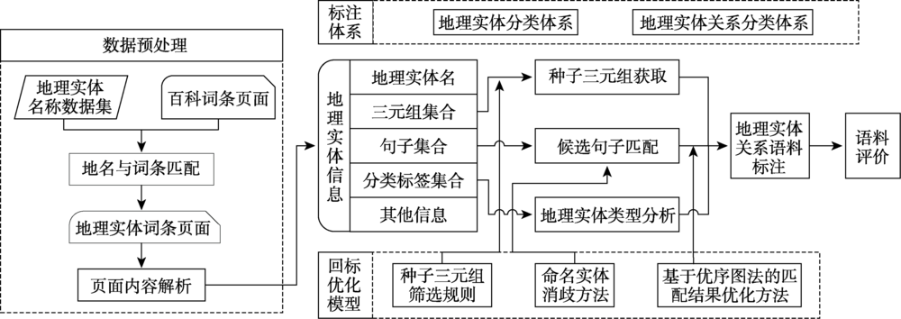 地理实体关系语料库自动构建包括:① 建立地理实体分类体系和地理实体关系分类体系,用于规范地理实体关系语料库的标注过程和表现形式。② 建立自动标注的核心流程,即:筛选种子三元组,利用命名实体消歧方法实现种子三元组与候选句子的匹配,利用优序图法实现匹配结果优选。③ 完成语料标注,评价语料质量。