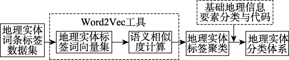 地理实体分类体系作为面向地理领域的专业标准,比通用命名实体分类体系更为细致。同时,网络文本的高度自由化要求地理实体分类还需兼顾语言的灵活性,需要形式化表达地理实体所蕴含地丰富地理语义。网络百科以开放标签标识词条类别,一个词条可有多个分类标签,但分类标签间层次关系不显著,与传统地理实体分类标准(如“基础地理信息要素分类与代码”)的分层次、不重复、标准统一等原则难契合。本研究在两种分类体系的基础上构建地理实体分类体系,以实现网络文本地理实体向标准地理要素标准的映射。Word2Vec是一个自然语言处理工具集,能够将字词转换为计算机可理解的词向量,并计算字词间的相似度。在本研究中,一个词条的分类标签集合视作一个“句子”,句中的每个标签作为一个词,形成Word2Vec的输入数据集;然后,利用N-gram语言模型计算词向量,将词向量间的余弦距离作为各标签的相似度度量,并利用系统聚类方法对标签进行聚类。最后,参考基础地理信息要素分类与代码标准,对标签分类结果进行调整优化,确定每一类目的类目名称、映射标签和从属关系,形成地理实体分类体系如图2所示。