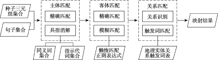 目前,自动回标技术在地理实体关系语料构建方面应用较少。Blessing等[19]基于英文维基百科,利用回标技术建立了河流与水系的“流入”关系、郊区与城镇的“组成”关系,标注的关系种类有限。杨腾飞[20]利用百度百科摘要中的超链接关键词和分类树信息做比较,构建景点关键词集合,实现针对景点的地理命名实体标注,但尚未深入到关系标注工作。尽管自动回标技术已经应用于构建地理关系标注语料库,但仍存在规模小、关系类型单一等不足。在相关研究的基础上,本文对自动回标技术进行了改进,并实验验证了其有效性。