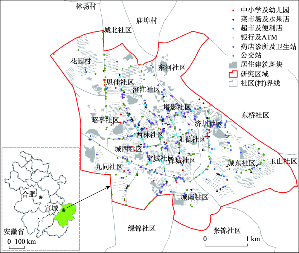 | 图1 城市公共设施要素空间分布及研究范围 |