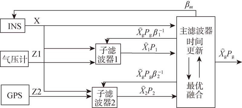 其中, β i (i =1, 2, …, n , m )为各个子滤波器的信息分配系数,还需满足 ∑ i = 1 n β i + β m = 1 。