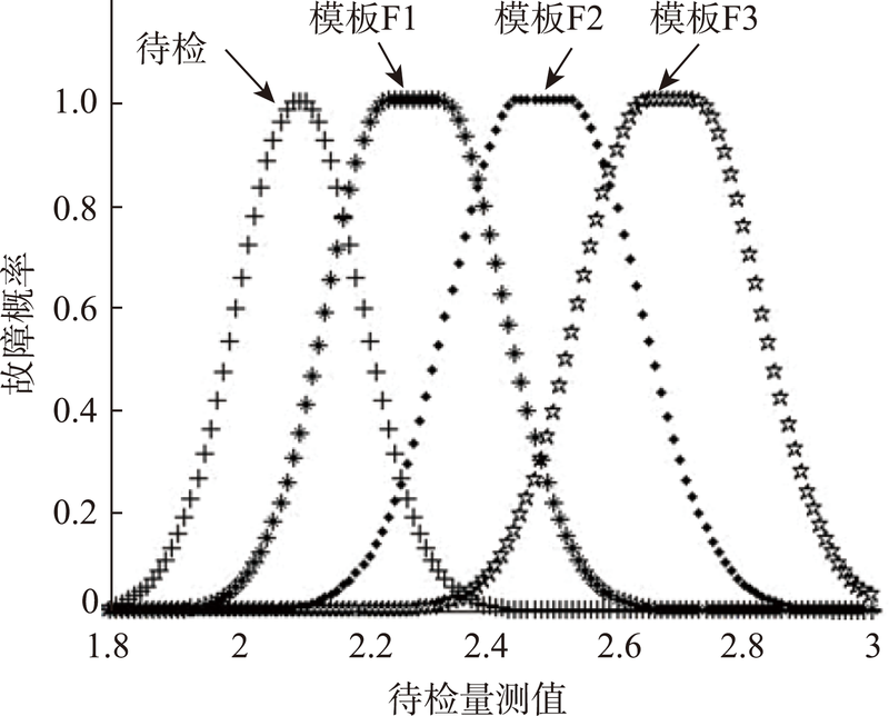 σ 、 M 为待检量测值 χ 的标准差和平均值。利用上述方法分别得出各个子系统在不同故障状态模式下的待检隶属度函数和模板隶属函数。图2 为一个子系统的多个故障模板隶属度函数所构成的故障模板库及所测数据构造的待检隶属度函数。