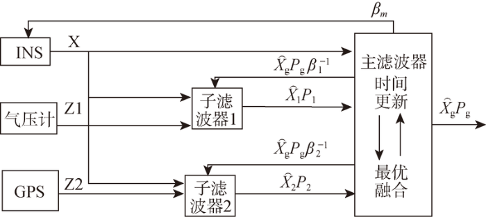 ... Carlson于1988年提出了一种基于分散化滤波思想的联邦滤波理论,该理论描述的联邦滤波结构是由一个公共主系统和若干子系统共同组成,从而构成了组合导航系统.其中各个子系统的量测量分别通过子滤波器中的kalman滤波算法得到局部估计结果,这些结果再由主滤波器进行融合处理,即可得到系统的全局最优估计[17 ,18 ] .有反馈式的联邦滤波结构还需要通过信息分配把全局最优估计和系统噪声分配给各个子滤波器.因此,本文以无人机的惯性导航系统(INS)为主参考系统,结合GPS和气压计实现了多源信息高程测量方案,如图1 所示. ...