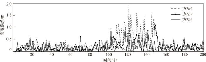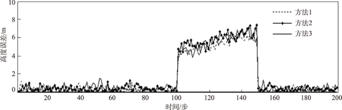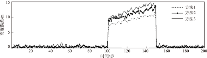 ... 飞行实验采用无人机遥测重点实验室研制的六旋翼无人机平台来验证,该飞行平台搭载有惯性导航系统(INS)ADIS16355,GPS/BD双定位模块S1216,气压计BM1383模块,通过读取它们的数据进行融合滤波,共同完成无人机的高程测量.试验时分别采用传统联邦滤波器固定值系数信息分配策略、协方差信息分配策略[7 ] 和本文的信息熵分配策略对数据融合滤波,然后由地面设备设置无人机在300 m高度进行悬停,悬停100 s后关闭气压计模块来模拟子系统故障,悬停150 s后重新打开气压计模块,悬停200 s后无人机降落,整个过程通过地面站记录数传电台发回的无人机高度数据信息,实验结束后分别计算出无人机在300 m高度悬停状态下的高程误差,如图8 所示. ...