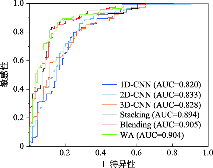 (3)本文通过Stacking,Blending和WA这3种异质集成策略将1D-CNN,2D-CNN和3D-CNN融合起来能够得到精度更高、鲁棒性更强的模型,其AUC较基分类器提升0.061~0.085,ACC提升4.35%~8.78%。其中,WA集成模型精度提升虽然不是最高,但有着结构简单,无额外超参数和易于复现等优点,具有更为广阔的应用前景。