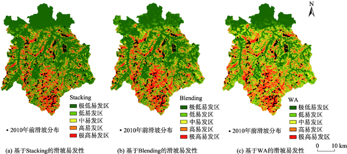 集成模型的易发性分区结果如图14所示,可以看出各个易发性分区空间分布与前面所述模型相似。3种集成模型易发性图中部地区都能发现与2D-CNN易发性图相似的一个类似椭圆的结构,这说明集成策略在结合综合各基分类器优点的同时,也能够继承基分类器的特征。