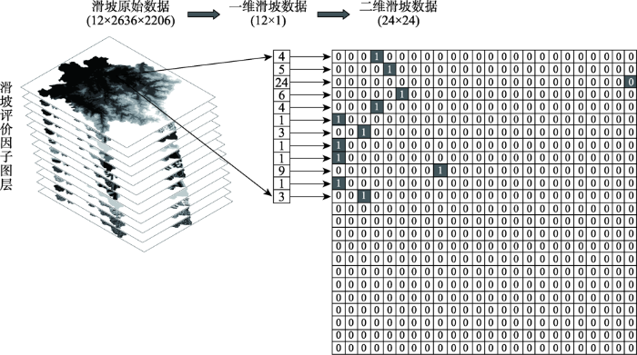 (1)如图2左半部分所示,堆叠所有的滑坡评价因子图层组成一幅多通道图像,该图像上各像素均可看作是一个一维特征向量,这些向量构成了一维滑坡数据表达方式。