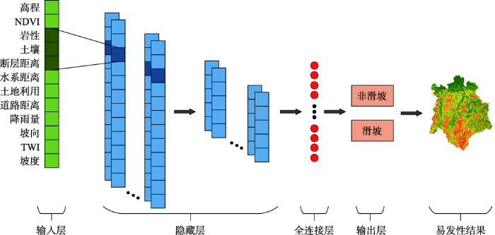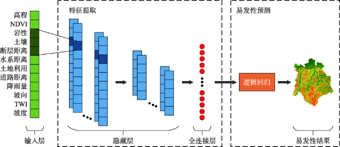 随着科学技术的发展,空间数据获取的便捷性与可靠性不断提升,统计学方法近年来被广泛的应用于滑坡易发性分析,包括:证据权法[11]、逻辑回 归[12](Logistic Regression, LR)和支持向量机[13,14]等。相比于传统统计学方法,支持向量机不需要数据符合某种特定分布,能够利用内积核函数代替向高维空间的非线性映射,从而取得较好的预测效果。近些年来,地质灾害数据的质量和数量大幅度提升,这些数据具有多源性、时空性和非线性等特点,如何对海量灾害数据进行准确且可靠的分析十分重要。深度学习作为当前人工智能领域的研究热点,在各个领域引起的广泛的关注。其中,作为深度学习中最具代表性的方法之一,卷积神经网络(Convolutional Neural Networks, CNN)具有强大的表征学习能力,能够按其阶层结构对输入信息进行平移不变分类,也被成功的应用于图像处理[15,16,17]、语音识别[18,19]、场景理解[20,21]、自动驾驶[22,23]等领域中。对于滑坡灾害来说,其成因机理复杂、影响因素众多,深度学习模型在理论上能够更好地模拟滑坡灾害的形成并准确预测潜在的滑坡。因此,基于CNN的滑坡易发性分析方法具有广阔的应用前景。