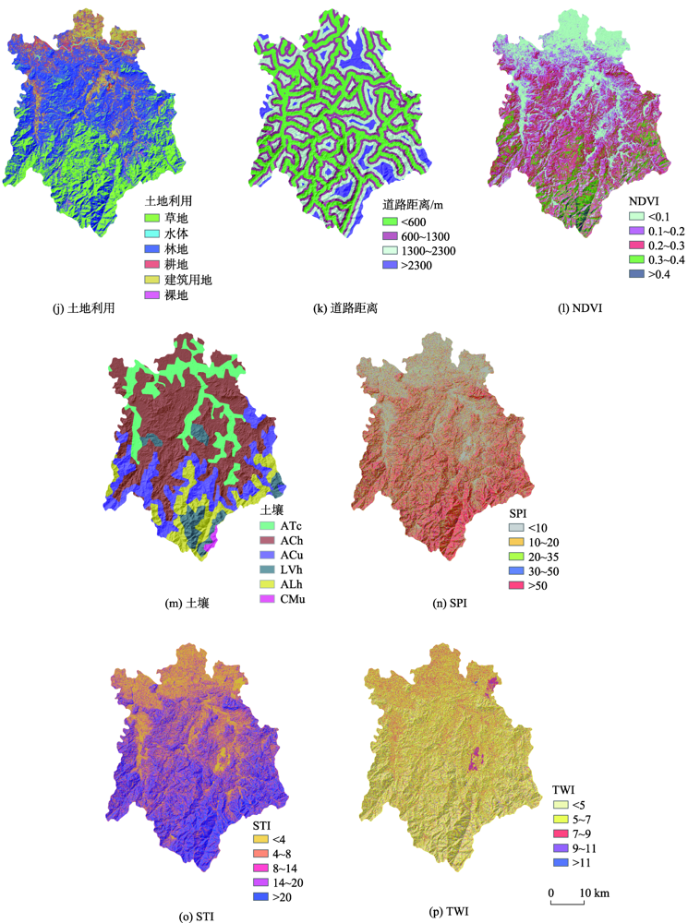 (13) SPI。SPI可用于描述地形表面给定地点水流的潜在侵蚀能力。随着流域面积和坡度的增加,来自于上坡面积的水量及流速也会相应增加,从而增大了侵蚀风险。本文将研究区SPI信息分成5个等级:< 10、10~20、20~35、35~50和> 50。