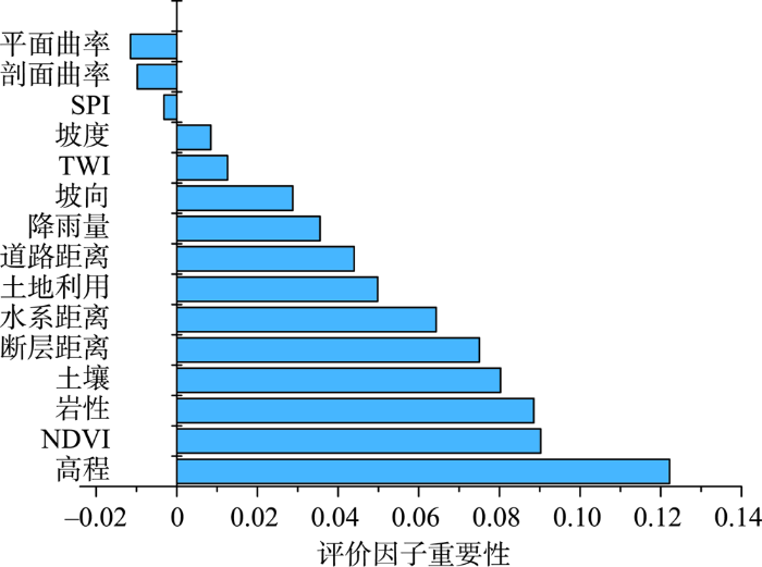 评价因子的选取对于滑坡易发性分析至关重要。本文通过野外调查研究及相关文献分析[10,14,34-36],综合考虑研究区的地形地貌、基础地质、水文条件等因素,最终选取16种滑坡评价因子,如图7所示。其中,DEM数据提取于1:50 000地形图;坡向、坡度、平面曲率和剖面曲率因子基于ArcGIS软件从DEM数据中提取;径流强度指数(Stream Power Index, SPI)、输沙指数(Sediment Transport Index, STI)、和地形湿度指数(Topographic Wetness Index, TWI)因子基于SAGA软件从DEM数据中提取;岩性和断层距离因子提取于中国地质调查局2002年完成的1: 200 000地质图;降雨量数据由江西省气象局提供,并对其进行克里金插值处理;水系网和道路网提取于1:50 000地形图,再利用欧氏距离工具得到水系距离和道路距离因子;利用支持向量机对2010年获取的Landsat-7卫星影像进行分类得到土地利用因子,该影像数据下载于地理空间数据云(
