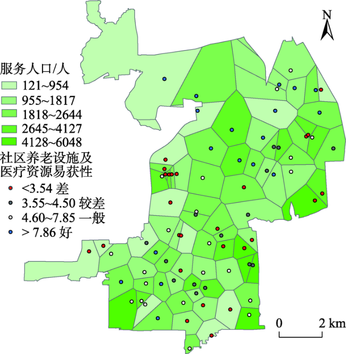 《北京市居住公共服务设施配置指标(2015)》[22]规定托老所、老年活动站场服务规模为0.7~1万人/处,因其未对老年人口占比进行说明,故本文沿用2006年20%的占比,推算出适中的服务人口容量为1400~2000人。