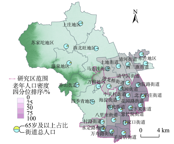 海淀区不仅城市化率高,也是北京市老龄化最典型的地区之一,其城市化水平和老龄化程度在全国甚至世界范围内都具有一定的代表性,本研究从服务覆盖率、供需比和医疗资源易获性三方面对海淀区的社区养老设施进行评价,研究方法和结果具有一定的代表性和普遍意义。