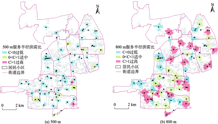 服务半径较小时,一些养老驿站位于小区组团边缘而非区域中心,无形中增加了老年人的出行距离,出现供大于求现象。当服务半径增加时,三环以内老年人口密度较大的区域养老驿站分布存在明显的空间不均衡,如800 m服务半径下,部分社区养老驿站数量不足,34%的养老驿站无法满足需求,与此同时,部分养老设施在短距离内密集分布,导致服务范围重叠,既造成资源浪费又降低了利用率。
