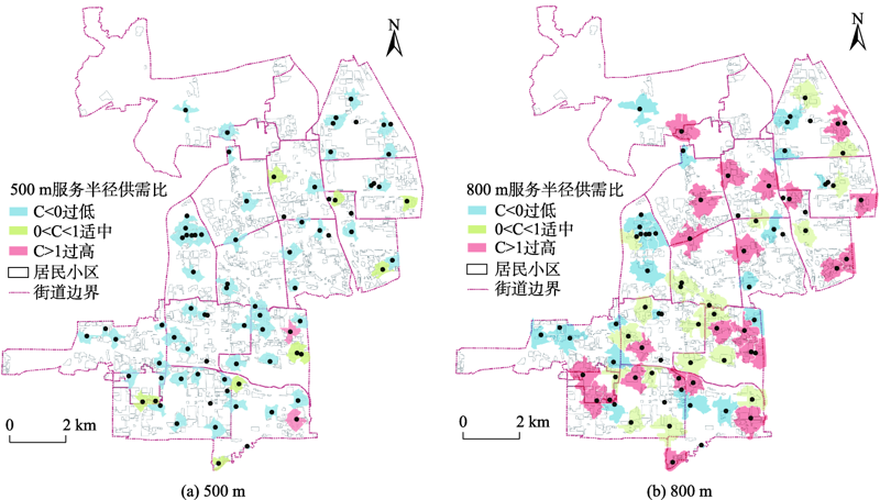 | 图6 2019年海淀区17个街道不同服务半径下养老驿站的供需比差异 |