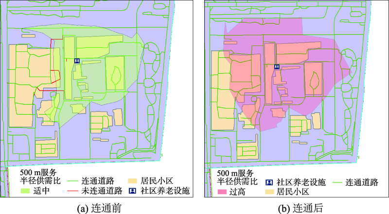 | 图7 花园路街道某养老驿站在小区道路连通前后500 m服务半径下的供需比变化 |