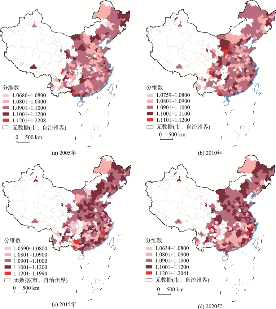| 图10 2005—2020年中国272个地级城市建成区蓝绿空间分维数空间分布 注:该图基于自然资源部标准地图网站审图号为GS(2020)4619的标准地图制作,底图无修改。由于数据获取困难,本研究不包括香港、台湾和澳门。 |