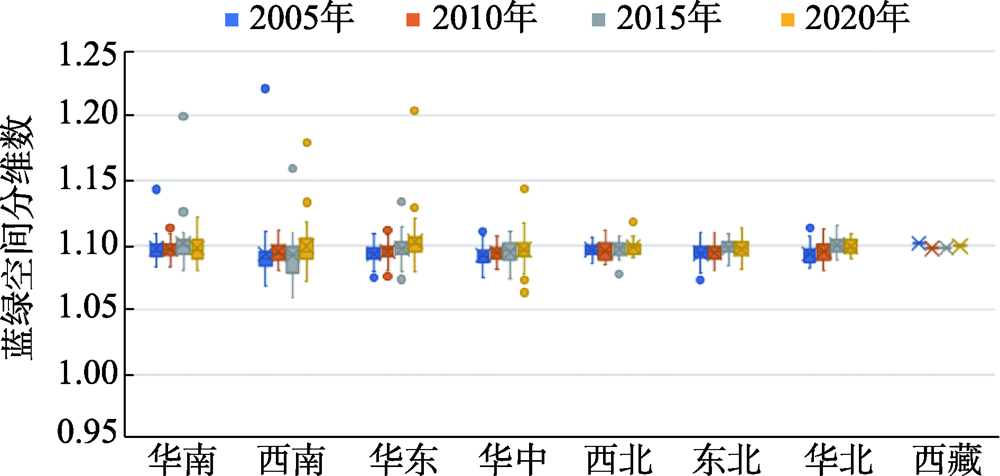 | 图11 2005—2020年272个地级城市建成区蓝绿空间分维数统计 |