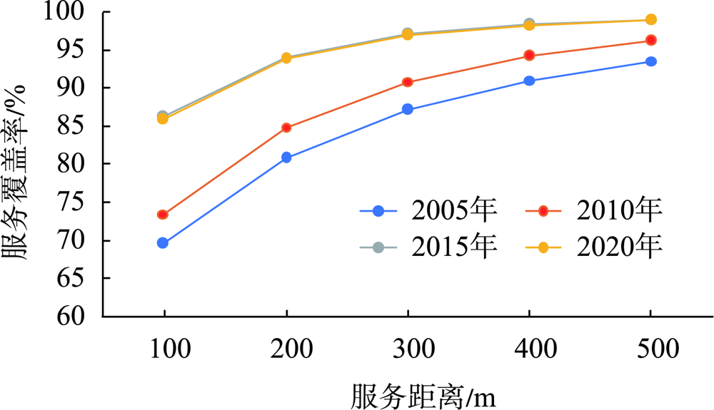 | 图4 不同年份100~500 m距离对应服务覆盖率 |