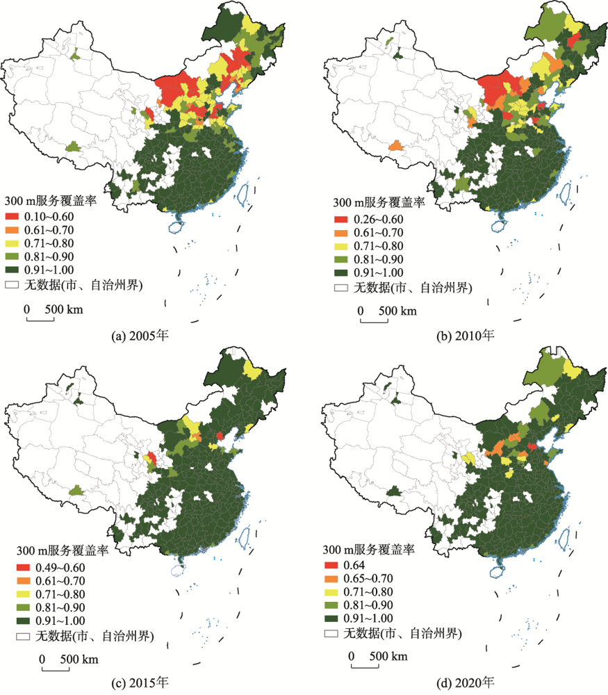 | Fig. 8 Spatial distribution of 300 m service area coverage rate in Chinese 272 urban built-up area from 2005 to 2020 |