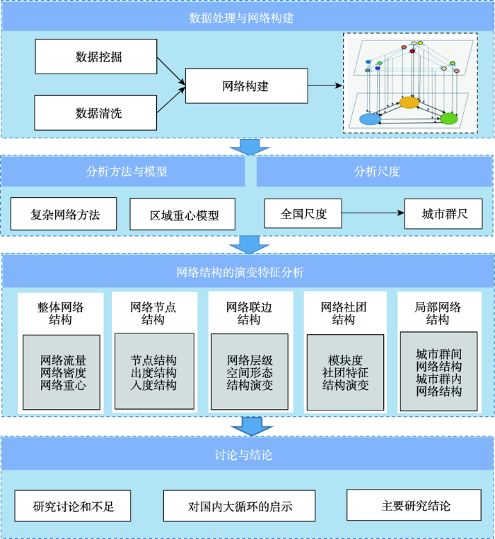 如图2所示,本研究的步骤如下:①梳理了基于企业联系视角的城际网络研究进展,并对基于企业内部联系构建城市网络的研究不足进行了分析;②基于A股上市公司及其前五大客户间的贸易流数据,构建了基于企业间联系的城际网络数据,形成本研究的基础数据库;③采用复杂网络、区域重心模型等方法,从全国尺度分析了网络的整体结构、节点结构、联边结构、社团结构的演变特征,从城市群尺度分析了城市群之间和主要城市群内部的网络结构演变特征。本研究有助于拓展基于企业间视角的城际网络分析,可以为优化国内大循环和统一大市场建设提供参考。