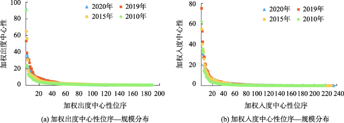 2010—2020年城市加权入度和加权出度中心性位序-规模分布