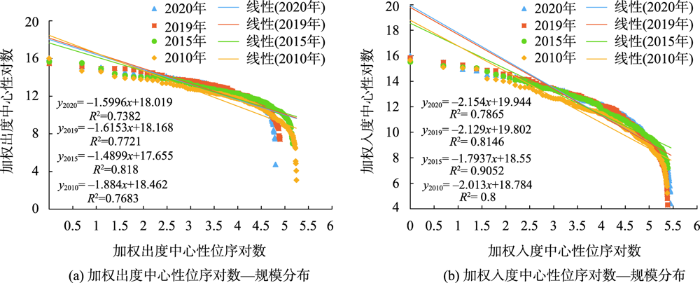 从2010、2015、2019、2020年城市的中心性位序—规模分布来看,均具有明显的“长尾分布”特点(图5),进一步分析中,对各地加权入度和加权出度中心性及其位序取对数,并进行线性拟合。如图6(a)所示,2010、2015、2019、2020年各城市加权出度线性拟合优度(R2)分别达到了0.77、0.82、0.77、0.74,具有较好的线性拟合关系;如图6(b)所示,各地加权入度线性拟合优度(R2)分别达到了0.80、0.91、0.81、0.79,同样具有较好的线性拟合关系,表明各地加权入度和加权出度符合幂律分布规律,网络呈现明显的“金字塔结构”特征,即只有少数的城市作为网络主要节点,绝大多数城市贸易流动吸纳能力较弱。